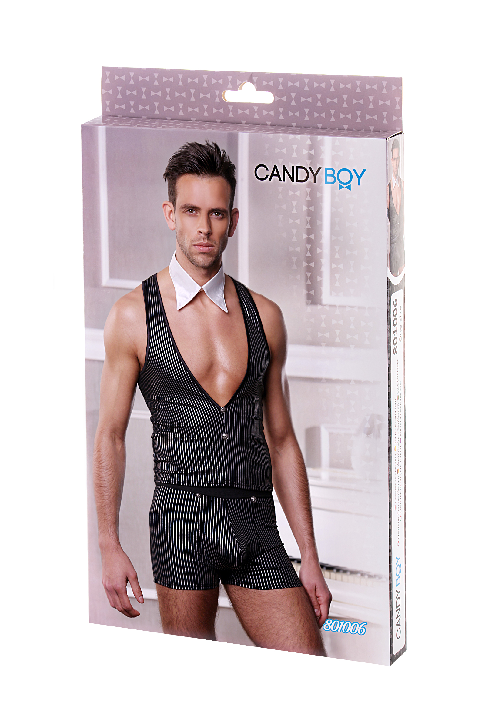 Роскошный костюм джентельмена Кэнди Бой чёрно-белого цвета. Эластичные шортики облегают соблазнительные мужские ягодицы, жилет с глубоким вырезом, белоснежный воротничок, придаёт вашему образу сексуальность и соблазнительность. Экспериментируйте со своей избранницей и получайте удовольствие.